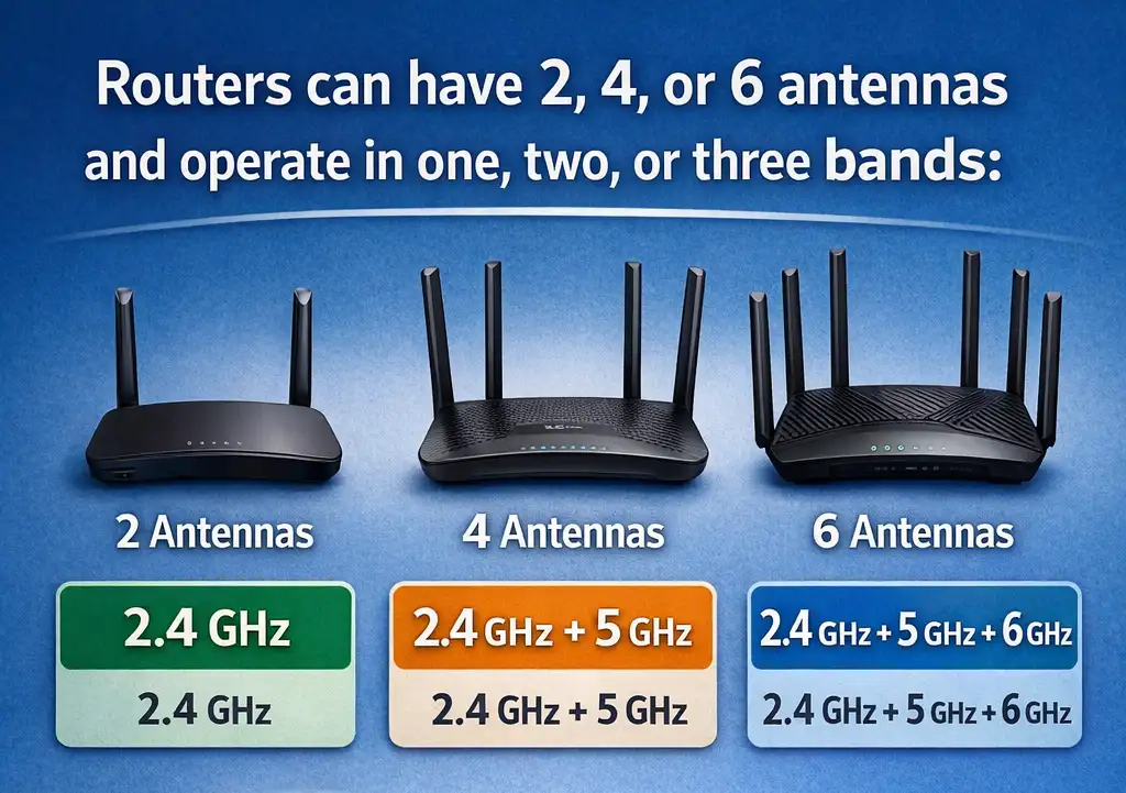 I dag kan routere have to, fire eller seks antenner og fungere i ét bånd (2,4 GHz), to bånd (2,4 GHz og 5 GHz) eller tre bånd (2,4 GHz, 5 GHz og 6 GHz). Derfor er det bedre at fokusere på detaljerede tekniske specifikationer frem for iøjnefaldende marketingudtryk.