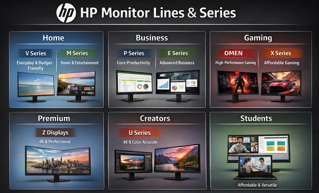HP tilbyder flere skærmlinjer, der hver er designet til at imødekomme specifikke brugerbehov og er tilpasset marketingstrategier. Når man vælger en skærm til arbejde, vil man naturligt kigge på modeller beregnet til kontor- eller erhvervsbrug.