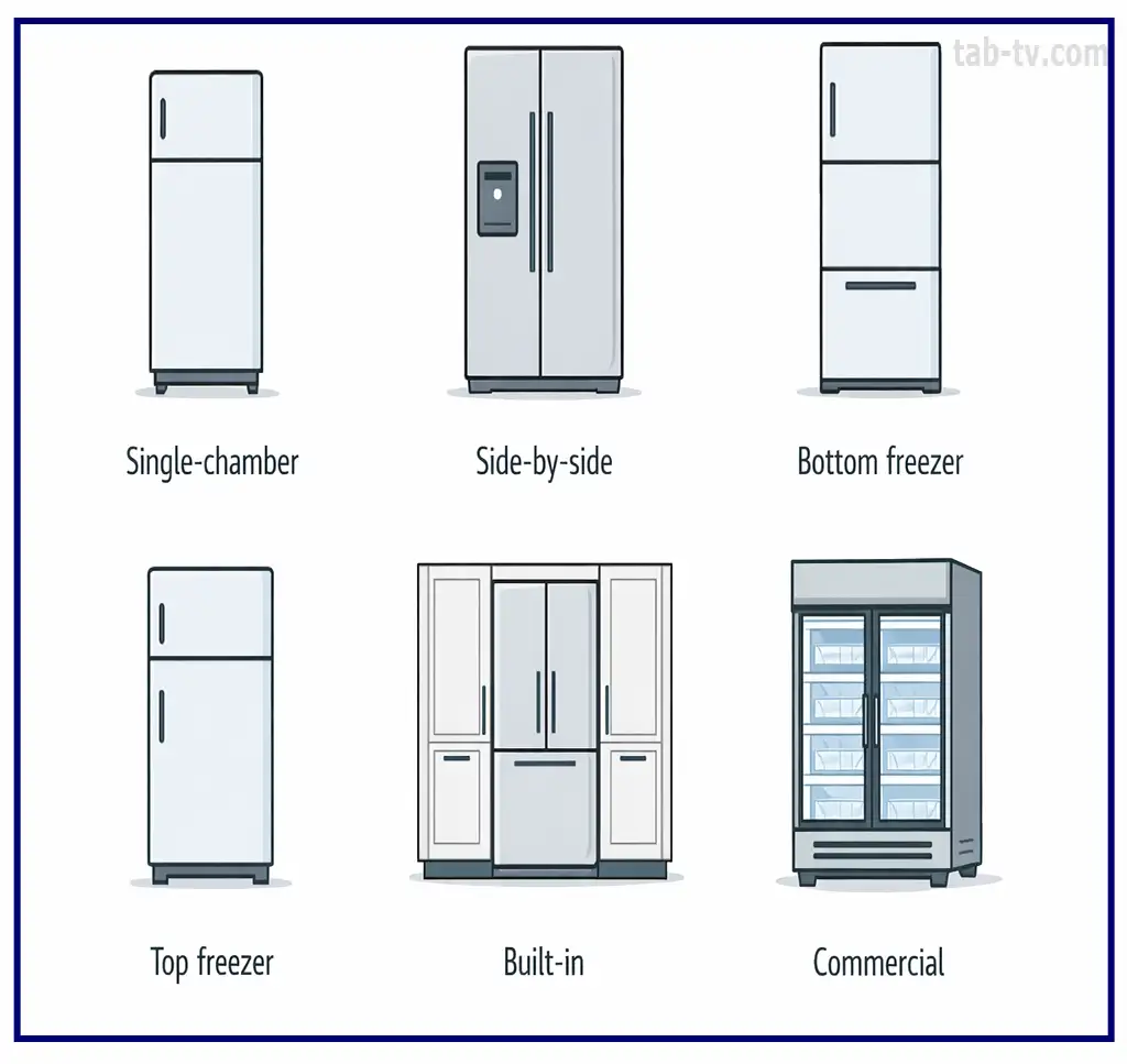 Enkeltkammermodeller er kompakte og har en lille fryser. Side-by-side-modeller har køle- og frysedelen placeret vertikalt, tilbyder stor kapacitet og inkluderer vand- og isdispensere. En mere praktisk løsning er et køleskab med fryseren nederst og hovedrummet i øjenhøjde. Modeller med fryser øverst er en klassisk løsning, men dette design betragtes nu som forældet, selvom sådanne køleskabe stadig produceres. Indbyggede køleskabe installeres i køkkenskabe; de er ret almindelige, og nogle producenter som Samsung har hele serier af sådanne produkter.